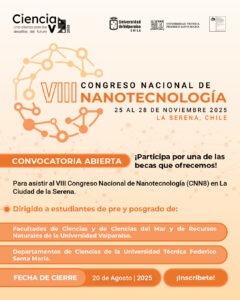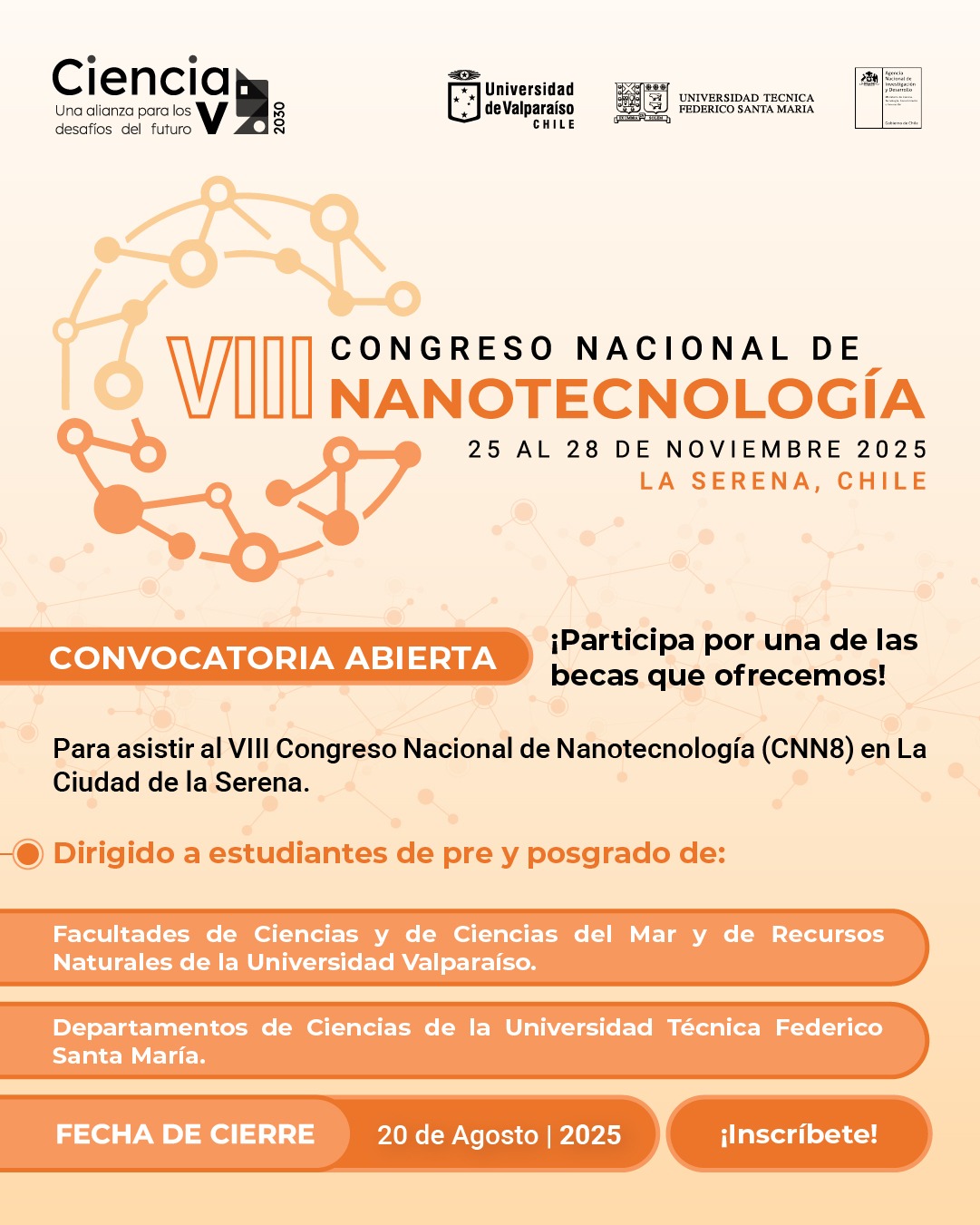 El proyecto Ciencia e Innovación 2030, impulsado por la Universidad Técnica Federico Santa María (UTFSM) a través de su Dirección General de Investigación, Innovación y Emprendimiento (DGIIE), abre la CONVOCATORIA VIII CONGRESO NACIONAL DE NANOTECNOLOGÍA (CNN8) con el objetivo de promover la participación activa de su comunidad estudiantil en eventos científicos y tecnológicos de relevancia nacional.